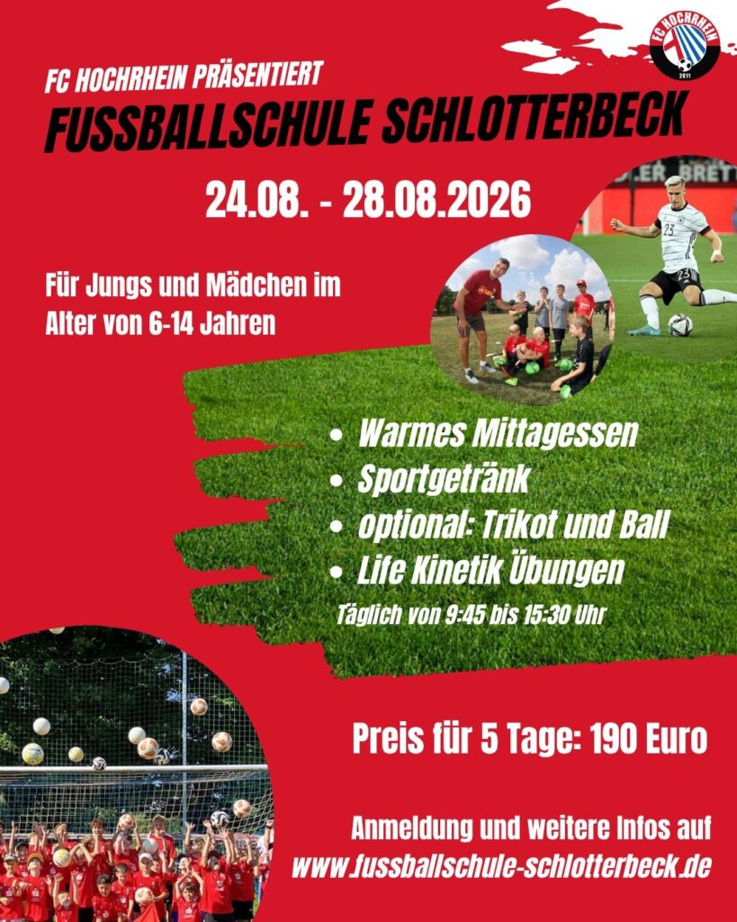 Die Fußballschule Schlotterbeck kommt zu uns! Vom 24.08. bis 28.08.2026 findet das Fußballcamp bei uns auf dem Sportplatz in Hohentengen statt.